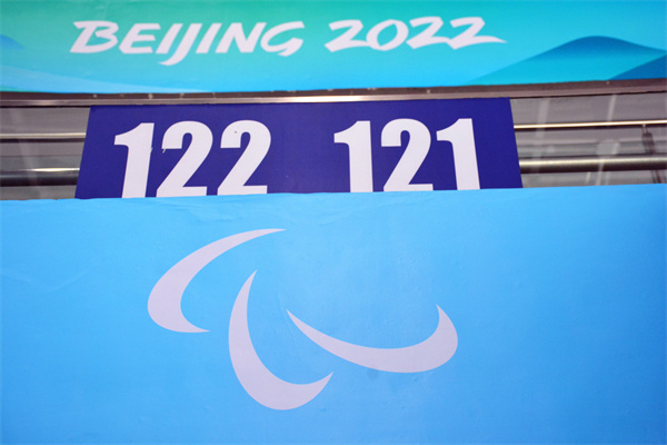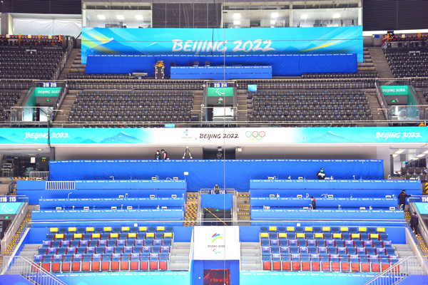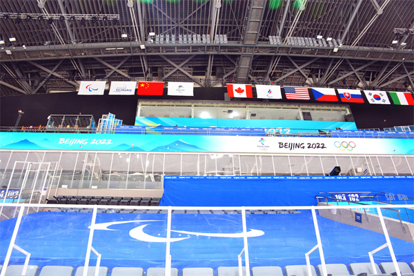 进入国家体育馆,可以看到场馆内绝大部分2022年北京冬奥会景观已更换为冬残奥会景观和标识。比赛场地上,国家体育馆场馆制冰团队在冰面上已完成冬残奥会标识的更换铺设工作,接下来制冰团队将进行冰面增厚作业;同时,礼宾团队收回了奥运会获奖国家旗帜,并更换了参赛国旗帜,旗帜顺序根据中文笔画数的大小排列。此外,媒体看台和内部围挡景观也基本更换完毕。