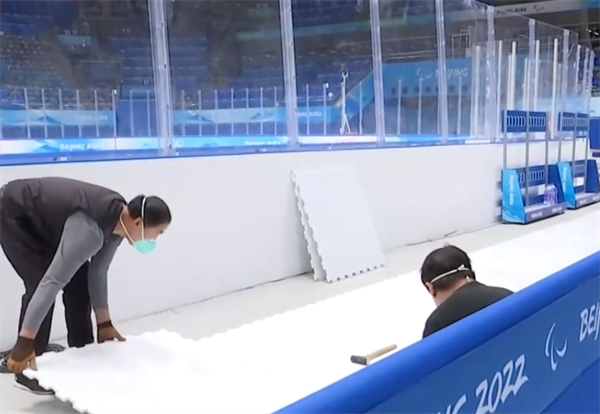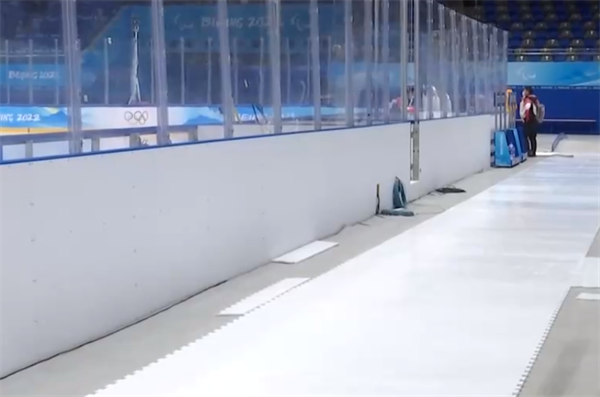 不仅如此,为了使残奥冰球运动员能够在国家体育馆无障碍通行,为他们创造一个非常舒适的比赛环境,我们在运动员更衣室、训练馆、赛场等区域都铺设了仿真冰板,主馆附近直达赛场的更衣室旁也修建了国际残奥委会要求的坡道,运动员可以乘坐冰橇直接从更衣室滑到比赛场地,整个过程都是无障碍的。目前场馆内的仿冰板铺设面积已达到300平方米。