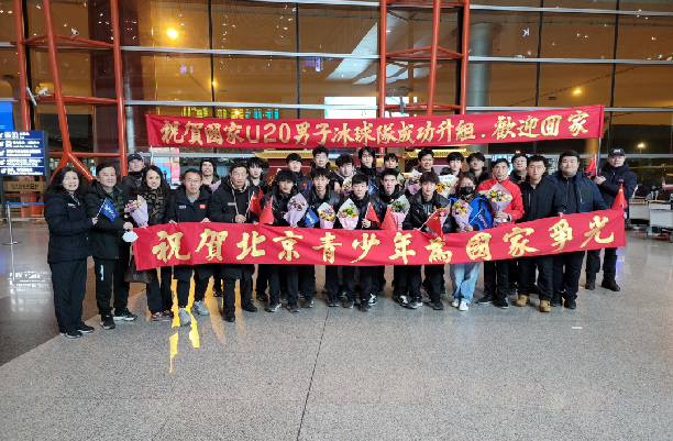 1月25日晚,在2023年U20世锦赛中以五战全胜佳绩成功升组的国家U20男子冰球队平安飞抵北京首都国际机场,载誉归来。北京市冬季运动管理中心主任李晓鸣等领导、北京市冰球运动协会工作人员来到机场迎接队伍。